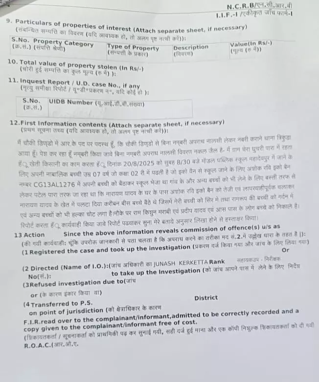 कृष्ण कुमार यादव- बलरामपुर। छत्तीसगढ़ के बलरामपुर जिले से ओवलोडिंग परिवहन करने वाले स्कूल वैन के चालक के खिलाफ FIR दर्ज हुई है। जिसके बाद डिंडो पुलिस चौकी ने स्कूल वैन को भी पुलिस ने जब्त कर लिया है। स्कूली बच्चों से भरी वैन बुधवार को दुर्घटना ग्रस्त हुई थी। जिसके बाद चालक की लापरवाही पर पुलिस ने कार्यवाही की है। क्षमता से ज्यादा बच्चों को स्कूल वैन में बैठाकर परिवहन किया जा रहा था। वैन में डिंडो पुलिस चौकी क्षेत्र के महादेव पुर गांव के एक निजी स्कूल के बच्चे बैठे थे।