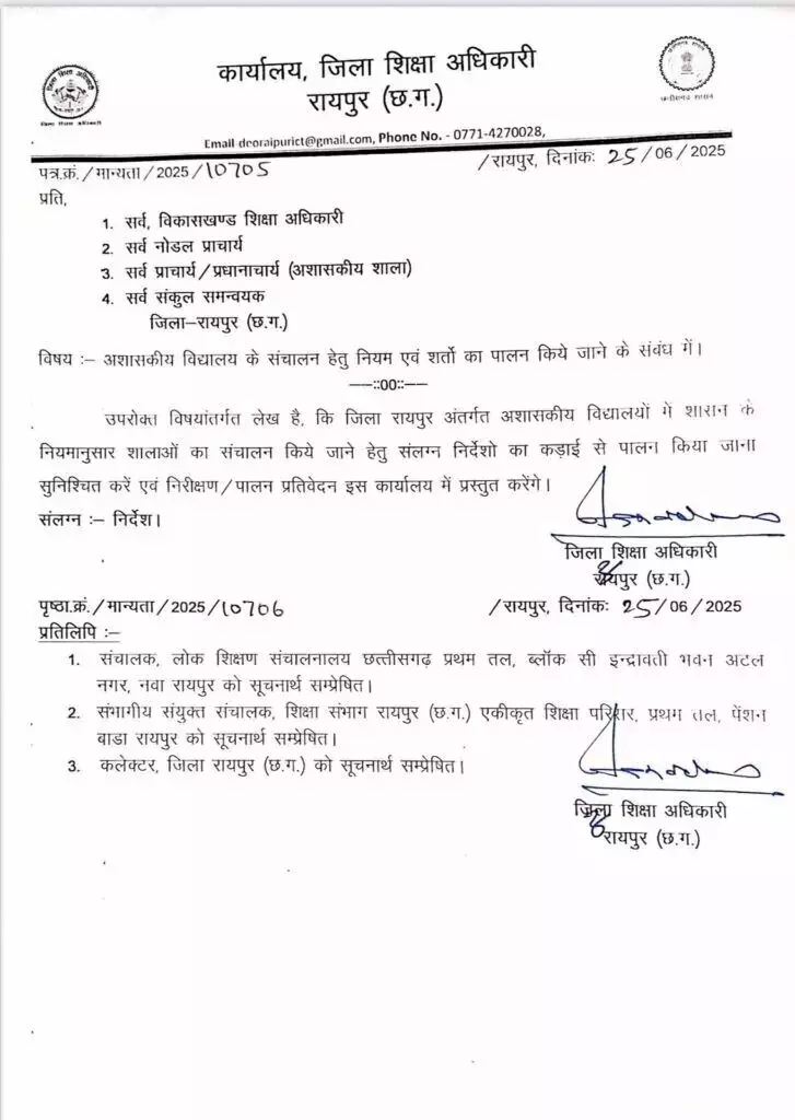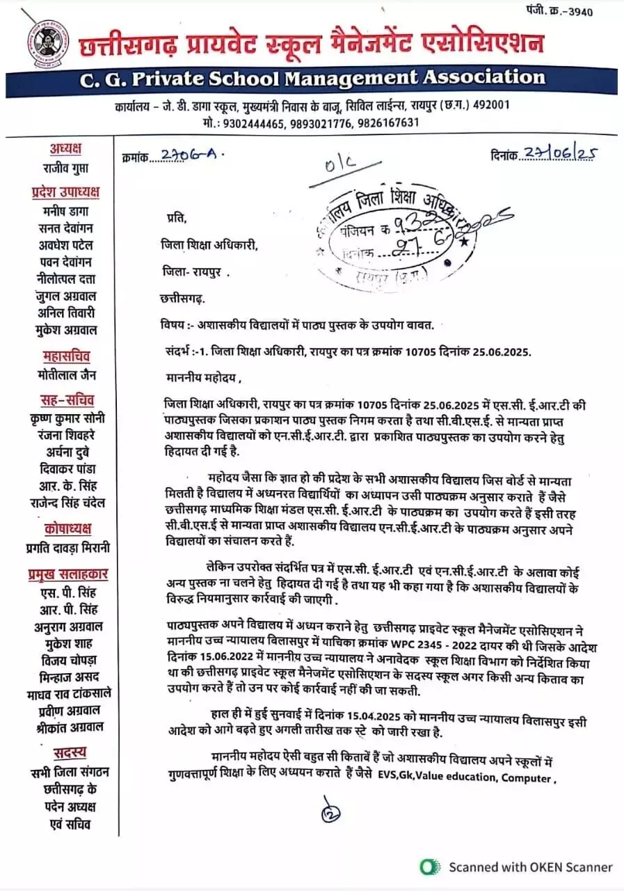 जारी आदेश के अनुसार, छत्तीसगढ़ बोर्ड से मान्यता प्राप्त है तो छत्तीसगढ़ शासन की निर्धारित पाठ्यपुस्तक ही अपने संस्था में लागू होगी। इसके अलावा यदि निजी प्रकाशक का पाठ्य पुस्तक को लेने के लिए पालकों को बाध्य नहीं कर सकते हैं। वहीं जिस बोर्ड से संस्था को मान्यता प्राप्त है उसे बोर्ड का नाम मेन गेट पर प्रदर्शित करना अनिवार्य होगा। साथ ही उसी बोर्ड से संबंधित पाठ्यपुस्तक का पठन-पाठन किया जायेगा।