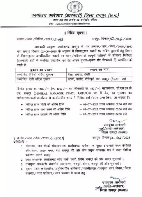 7 नई शराब दुकान खोलने की तैयारी: इनमें से 5 आरंग विधानसभा क्षेत्र में खुलेगी, आबकारी आयुक्त ने जारी की निविदा