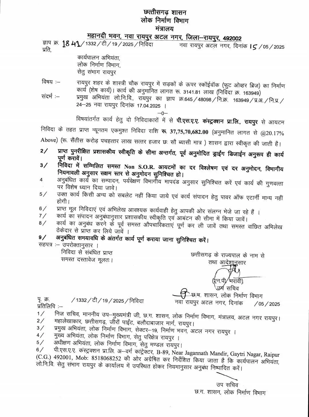 रायपुर। राजधानी रायपुर वासियों के लिए सिरदर्द बन चुका अधूरा स्कॉई वॉक प्रोजेक्ट (फूट ओवरब्रिज) जल्द ही अपने स्वरूप में दिखेगा। इसका निर्माण पूर्ण कराने का फैसला शासन ने ले लिया है। इसके लिए 37 करोड़ 75 लाख रुपए से अधिक की राशि को स्वीकृति भी दी गई है। इस स्वीकृति के बाद लोक निर्माण विभाग ने अधूरे निर्माण कार्य को पूर्ण करने के लिए टेंडर जारी किया था, जिसका ठेका पीएसएए कंस्ट्रक्शन कंपनी रायपुर को दिया है। स्कॉई वॉक प्रोजेक्ट पिछले 8 वर्षों से अधूरा पड़ा हुआ है।