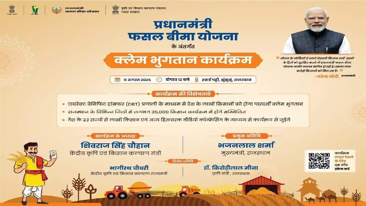 प्रधानमंत्री फसल बीमा योजना के अंतर्गत यह भुगतान 11 अगस्त 2025 (सोमवार) को राष्ट्रव्यापी प्रत्यक्ष लाभ हस्तांतरण आधारित स्वचालित प्रणाली के माध्यम से केंद्रीय कृषि एवं किसान कल्याण मंत्री शिवराज सिंह चौहान की अध्यक्षता में राजस्थान के झुंझुनू में आयोजित कार्यक्रम में होगी। इस अवसर पर आयोजित कार्यक्रम के मुख्य अतिथि राजस्थान के मुख्यमंत्री भजनलाल शर्मा होंगे। कार्यक्रम में केन्द्रीय कृषि एवं किसान कल्याण मंत्री भागीरथ चौधरी, राजस्थान के कृषि मंत्री डॉ. किशोरी लाल मीना विशिष्ट अतिथि होंगे।