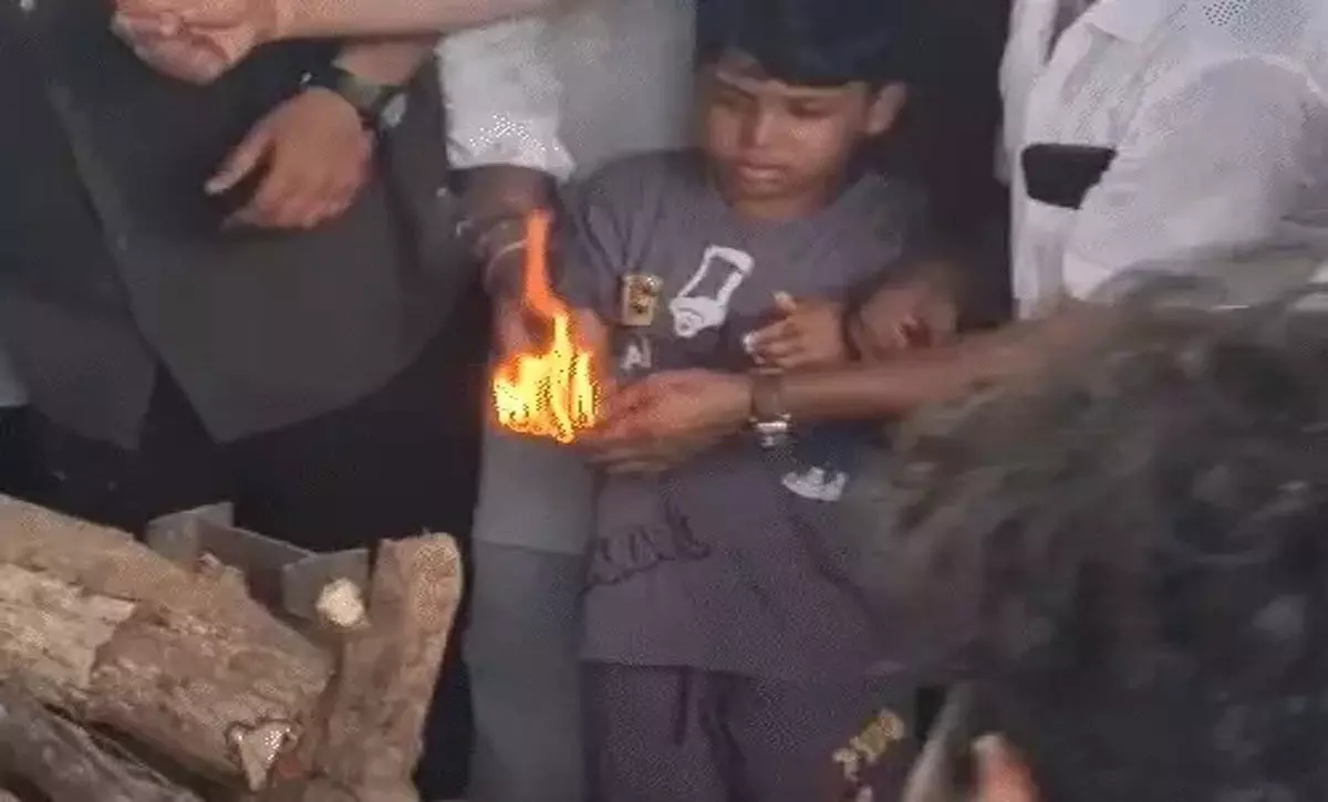 मुखग्नि देता हुआ एएसपी का नन्हा बेटा।