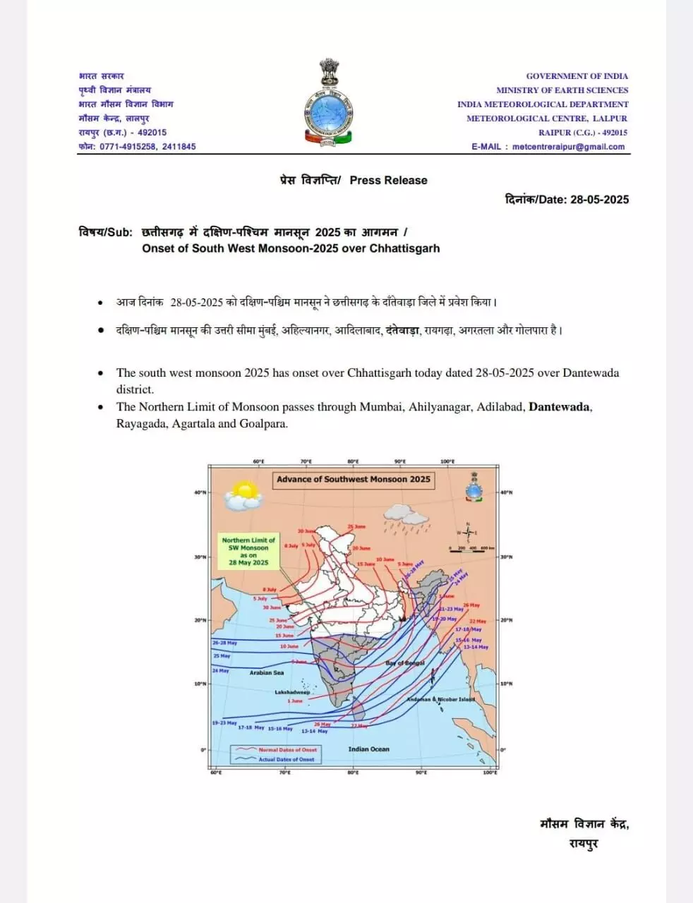 भारतीय मौसम विज्ञान विभाग (IMD) ने पुष्टि की है कि 2025 का मानसून महाराष्ट्र के रास्ते होते हुए दंतेवाड़ा जिले से छत्तीसगढ़ में प्रवेश कर चुका है। यह सामान्य समय से करीब 12 दिन पहले हुआ है, जो राज्य में मानसून की असामान्य शुरुआत मानी जा रही है। वर्तमान में मानसून की उत्तरी सीमा मुंबई, अहिल्यानगर, आदिलाबाद, दंतेवाड़ा, रायगढ़ा, अगरतला और गोलपारा तक पहुंच चुकी है।