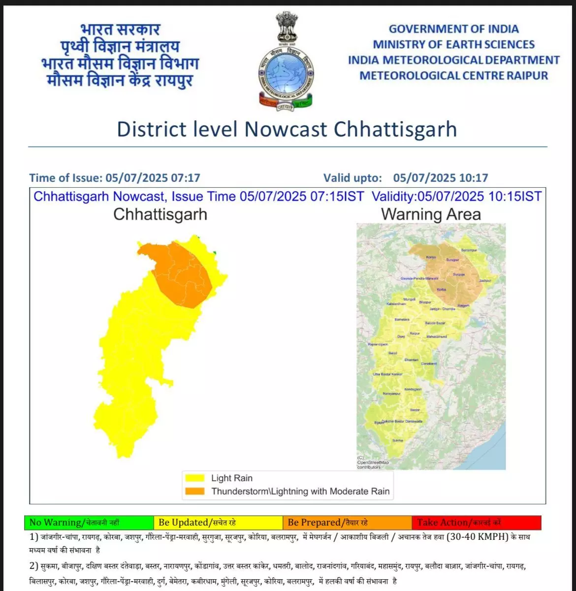 जानकारी के अनुसार, इन जिलों ऑरेंज अलर्ट जारी है। जांजगीर, रायगढ़, कोरबा, जशपुर और कोरिया जिले ऑरेंज अलर्ट की चपेट में हैं। इन क्षेत्रों में तेज हवाओं (30-40 किमी/घंटा) के साथ बिजली गिरने की भी आशंका जताई गई है।