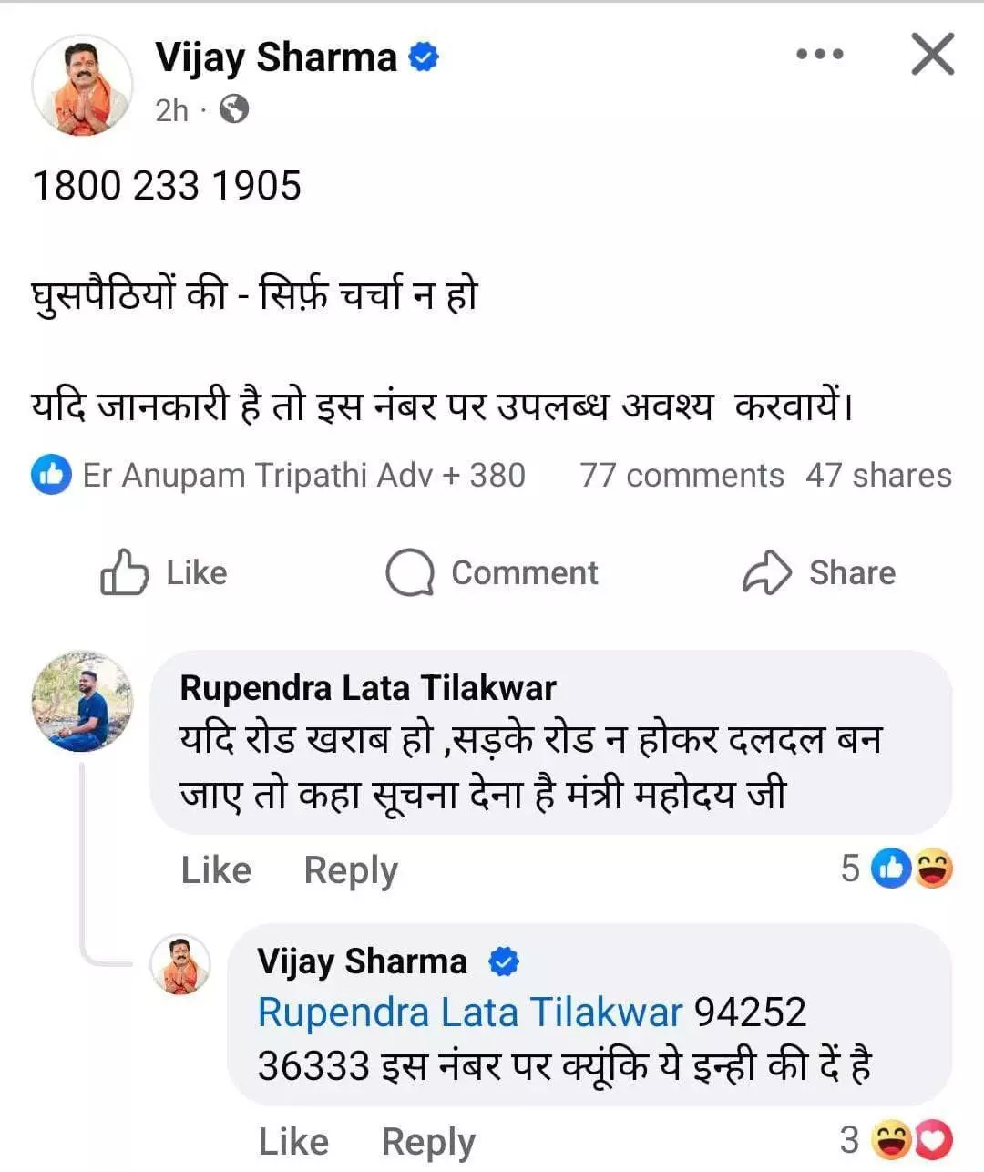 रायपुर। छत्तीसगढ़ में घुसपैठियों की शिकायत और उनकी जानकारी देने के लिए डिप्टी सीएम विजय शर्मा ने नंबर जारी किया। लेकिन इसी बीच डिप्टी सीएम की पोस्ट पर एक यूजर ने कमेंट करते हुए लिखा कि, यदि रोड ख़राब और सड़क दलदल बन गई हो तो सूचना कहां देना है। जिसके बाद डिप्टी सीएम श्री ने पूर्व सीएम भूपेश बघेल का नंबर शेयर करते हुए लिखा कि, इस नंबर पर क्योंकि, ये इन्ही की देन हैं।