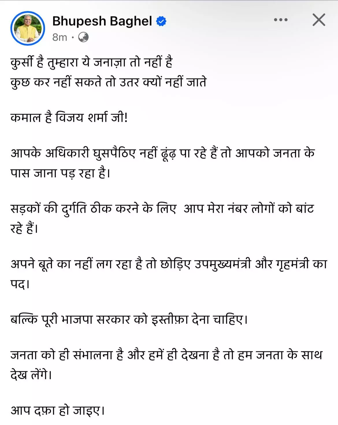 वहीं पूर्व सीएम भूपेश बघेल ने पलटवार करते हुए पोस्ट किया कि, कुर्सी है तुम्हारा ये जनाज़ा तो नहीं है कुछ कर नहीं सकते तो उतर क्यों नहीं जाते, कमाल है विजय शर्मा जी ! आपके अधिकारी घुसपैठिए नहीं ढूंढ़ पा रहे हैं तो आपको जनता के पास जाना पड़ रहा है। सड़कों की दुर्गति ठीक करने के लिए आप मेरा नंबर लोगों को बांट रहे हैं। अपने बूते का नहीं लग रहा है तो छोड़िए उपमुख्यमंत्री और गृहमंत्री का पद। बल्कि पूरी भाजपा सरकार को इस्तीफ़ा देना चाहिए। जनता को ही संभालना है और हमें ही देखना है तो हम जनता के साथ देख लेंगे। आप दफ़ा हो जाइए।