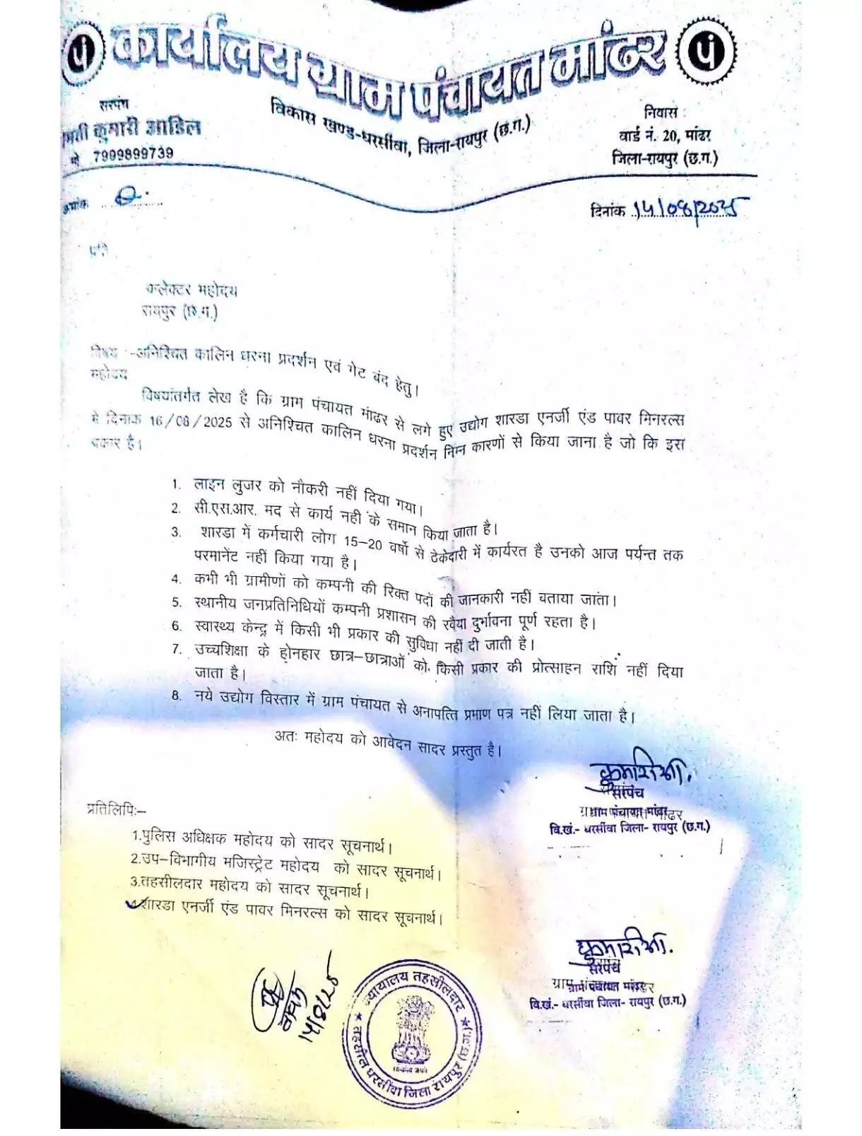 सरपंचों ने कंपनी प्रबंधन तथा तहसीलदार, पुलिस और संबंधित अधिकारियों को ज्ञापन सौंपकर बताया था कि, लाइन लुजर को नौकरी नहीं दिया जा रहा है । सी.एस.आर. मद से कार्य ग्राम पंचायतों में नहीं हो रहा है। शारदा में कर्मचारी लोग 15-20 वर्षों से ठेकेदारी में कार्यरत हैं। उनको आज तक परमानेंट नहीं किया गया है। कभी भी ग्रामीणों को कपनी की रिक्त पदों की जानकारी नहीं दिया जाता। है। स्थानीय जनप्रतिनिधियों कंपनी प्रशासन की रवैया दुर्भावना पूर्ण रहता है। स्वास्थ्य केन्द्र में किसी भी प्रकार की सुविधा नहीं दी जाती है। उच्चशिक्षा के होनहार छात्र-छात्राओं को किसी भी प्रकार का प्रोत्साहन राशि नहीं दिया जाता है। नए उद्योग विस्तार में ग्राम पंचायत से अनापत्ति प्रमाण पत्र नहीं लिया जाता है।
