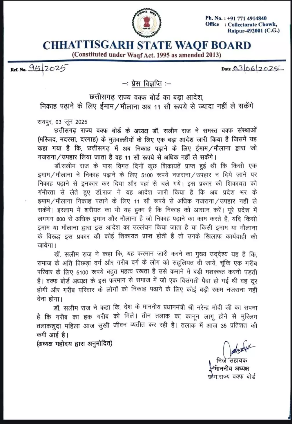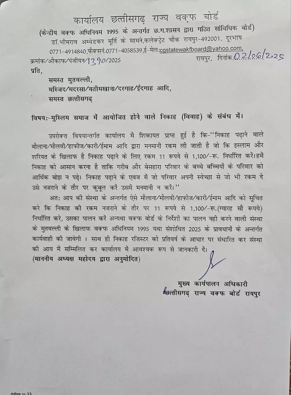 छत्तीसगढ़ वक्फ बोर्ड का बड़ा फरमान: मौलवी, हाफिज या ईमाम निकाह पढ़ाने का अब नहीं ले सकेंगे 11 सौ रुपए से ज्यादा की रकम