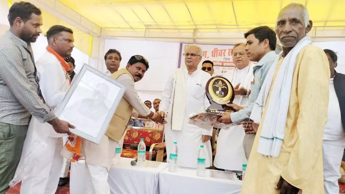 पूर्व सीएम भूपेश बघेल को प्रतीक चिन्ह भेंट करते लोग