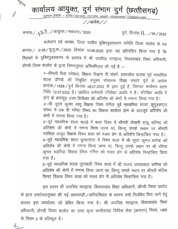 शिक्षकों के युक्तियुक्तकरण की प्रक्रिया में अनियमितता बरतने के मामले में संभागायुक्त दुर्ग ने बालोद जिले के डौण्डी बीईओ जयसिंह भारद्वाज को तत्काल प्रभाव से निलंबित कर दिया है। यह कार्रवाई जिला स्तरीय युक्तियुक्तकरण समिति, बालोद की जांच रिपोर्ट के आधार पर की गई है। जिसमें शिक्षक युक्तियुक्तकरण प्रक्रिया में विकासख गंभीर अनियमितताएं बरतने का मामला पकड़ में आया है।
