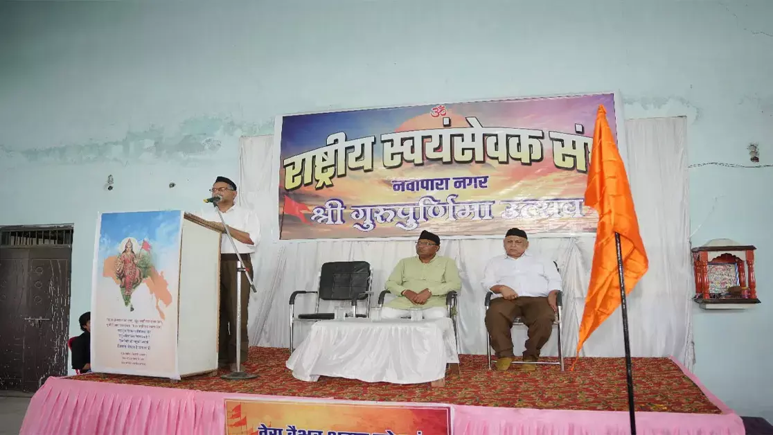 गुरु पूर्णिमा के कार्यक्रम में स्वयंसेवकों को संबोधित करते हुए मुख्य वक्ता
