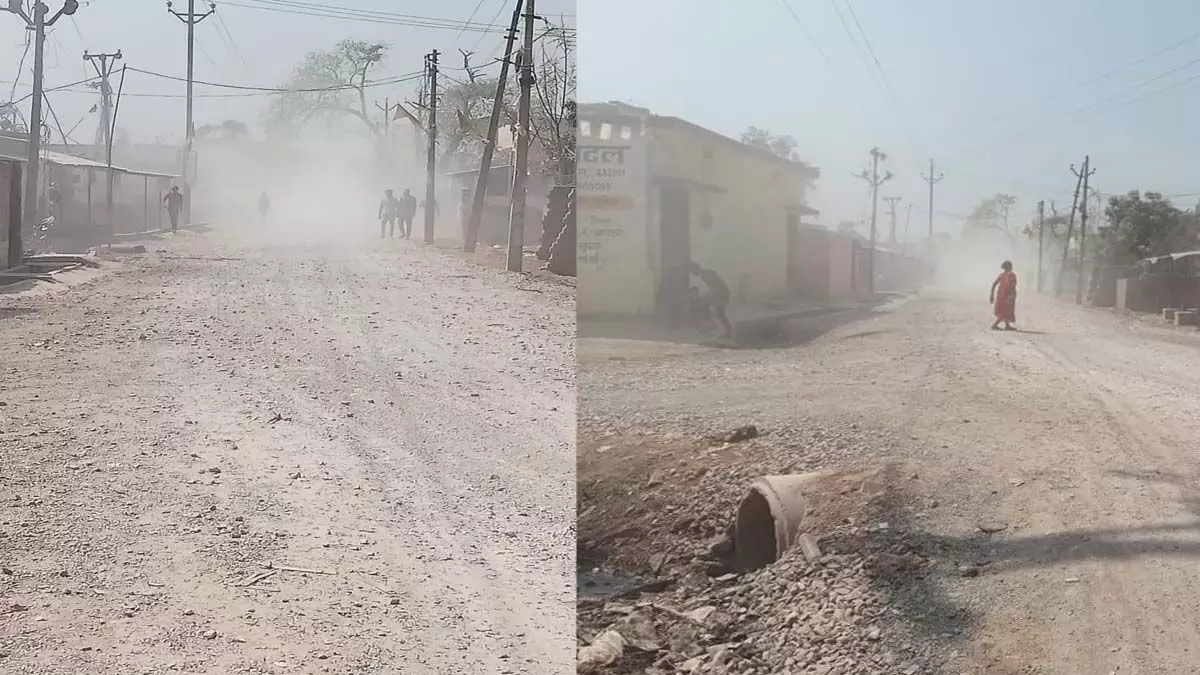 भारी वाहनों की आवाजाही के कारण पूरे गांव में धूल