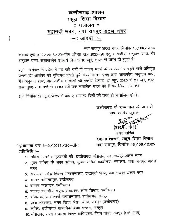 रायपुर। छत्तीसगढ़ में आज से शाला उत्सव मनाया जायेगा। प्रदेशभर में आज स्कूलों का नया सत्र प्रारंभ हो गया है। इस बीच भीषण गर्मी को देखते हुए समय में बदलाव करने का निर्णय लिया गया है। वहीं इस संबंध में स्कूल शिक्षा विभाग ने एक आदेश जारी किया है। जिसके अनुसार, कक्षाएं दिनांक 17 से 21 जून तक सुबह 7.00 बजे से 11.00 बजे तक संचालित किया जायेगा।