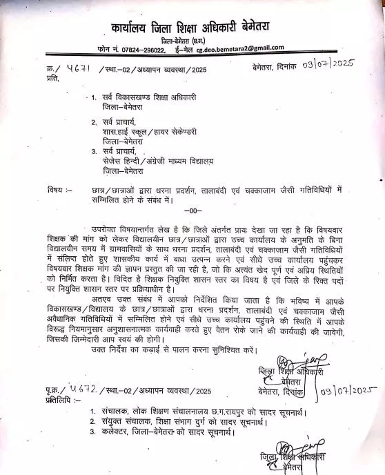 सूरज सिन्हा - बेमेतरा। छत्तीसगढ़ के बेमेतरा जिले के विद्यार्थी अब बिना अनुमति विद्यालयीन समय पर धरना प्रदर्शन नहीं कर सकेंगे। इस संबंध में जिला शिक्षा अधिकारी ने डॉ. कमल कपूर बंजारे ने आदेश जारी कर धरना प्रदर्शन करने पर प्रतिबंध लगा दिया गया है। साथ ही जिसमें जिले के सभी स्कूल के प्राचार्यों और बीईओ को भी चेतावनी दी है आदेश में नियमों के उल्लंघन होने पर कड़ी कार्रवाई की बात कही गई है।
