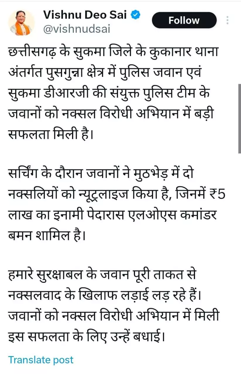 एंटी नक्सल ऑपरेशन में बड़ी सफलता: LOS कमांडर समेत दो नक्सली ढेर, हथियार समेत कई सामान बरामद
