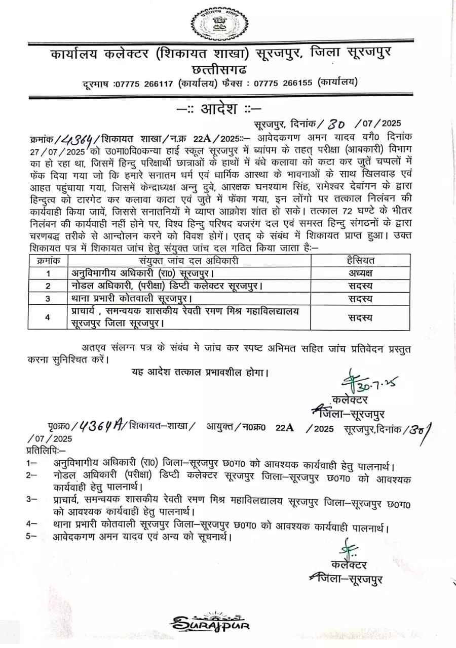 इस समिति की अध्यक्षता सूरजपुर एसडीएम को सौंपी गई है, जो पूरे घटनाक्रम की विस्तृत जांच कर रिपोर्ट सौंपेगी। आरोप है कि, परीक्षा के नाम पर केंद्राध्यक्ष और दो आरक्षकों ने हिंदू परीक्षार्थियों से जबरन कलावा उतरवाया गया, जिससे धार्मिक भावनाओं को ठेस पहुंचा है।