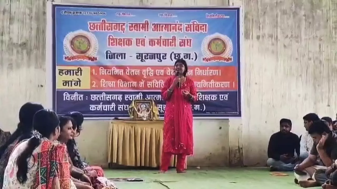 नौशाद अहमद - सूरजपुर। छत्तीसगढ़ के सूरजपुर जिले में स्वामी आत्मानंद उत्कृष्ट विद्यालय से शिक्षकों और कर्मचारियों से सम्बंधित एक खबर सामने आई है। शिक्षकों और कर्मचारियों ने रविवार को अपनी लंबित मांगों को लेकर जिला मुख्यालय के रंगमंच मैदान में जोरदार सांकेतिक धरना दिया। संघ के बैनर तले जुटे शिक्षकों ने साफ कहा कि, वे वर्षों से पूरी निष्ठा से बच्चों को गुणवत्तापूर्ण शिक्षा दे रहे हैं, इसके बावजूद सरकार उनकी वेतन और स्थायीकरण की मांगों को अनसुना कर रही है।