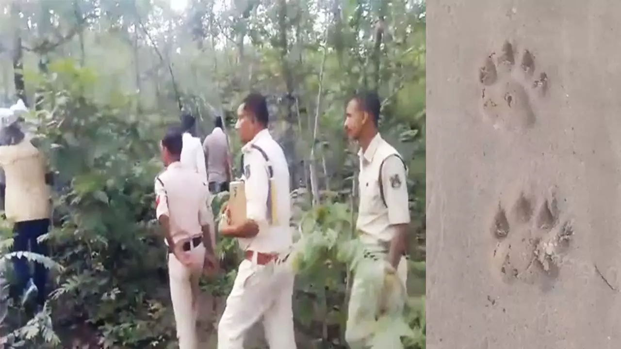 जांच करती हुई पुलिस टीम और बाघ के पंजों के निशान