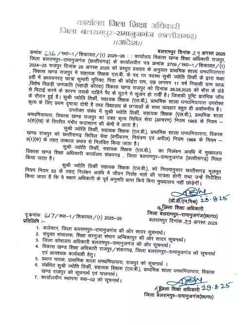 कृष्ण कुमार यादव - बलरामपुर। छत्तीसगढ़ के बलरामपुर जिले में छात्रा की पिटाई करने के मामले में डीईओ ने शिक्षिका ज्योति तिर्की को निलंबित कर दिया। बताया जा रहा है कि, 28 अगस्त को 5वीं कक्षा की छात्रा की बांस की छड़ी से शिक्षिका ज्योति तिर्की ने पिटाई कर दी थी। शिक्षिका ने इतना पीटा कि, छात्रा के पैर में सूजन गया था। इसकी शिकायत मिलने पर बीईओ ने मामले की जांच की, तब खुलासा हुआ। मामला राजपुर विकासखंड के प्रायमरी स्कूल धमधमियापारा की है।
