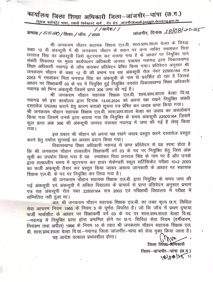मुकेश बैस - जांजगीर चाम्पा। छत्तीसगढ़ के जांजगीर चाम्पा जिले में शिक्षा विभाग ने बड़ी कार्रवाई की है। जहां फर्जीवाड़ा कर शिक्षाकर्मी की नौकरी पाने वाले शिक्षक को बर्खास्त कर दिया गया। बताया जा रहा है कि, कक्षा 12वीं की अंकसूची में कुटरचना कर शिक्षाकर्मी बन गया था। फर्जी अंक सूची के आधार पर 2007 से नौकरी कर रहा था। लोक आयोग को लगातार शिकायत मिल रही थी।