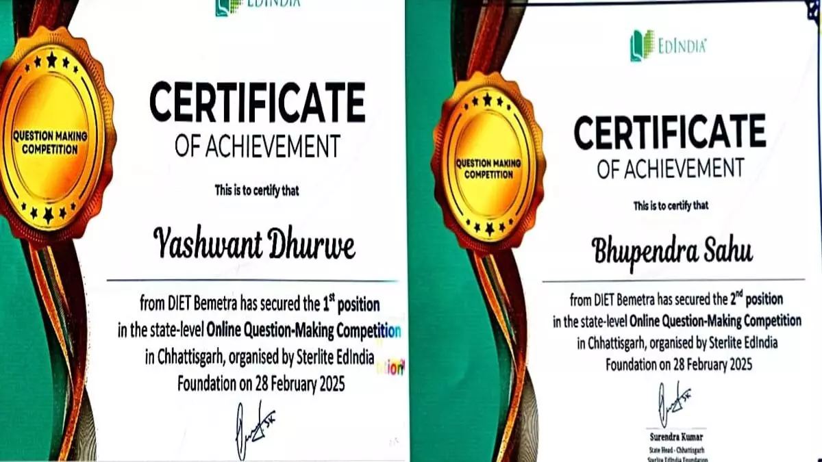 डाइट बेमेतरा की उपलब्धि: छात्राध्यापकों ने राष्ट्रीय मंच पर किया उत्कृष्ट प्रदर्शन, प्रथम-द्वितीय स्थान पाने वाले सम्मानित