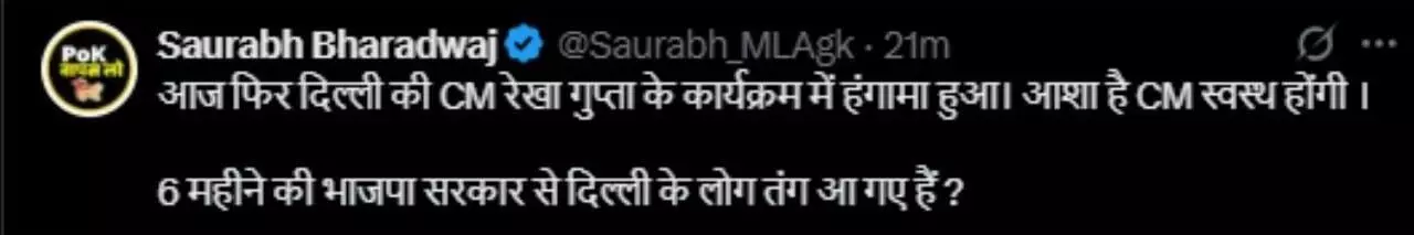 आम आदमी पार्टी, दिल्ली के प्रदेश संयोजक सौरभ भारद्वाज ने एक्स पर लिखा, 'आज फिर दिल्ली की CM रेखा गुप्ता के कार्यक्रम में हंगामा हुआ। आशा है CM स्वस्थ होंगी। 6 महीने की भाजपा सरकार से दिल्ली के लोग तंग आ गए हैं ?'