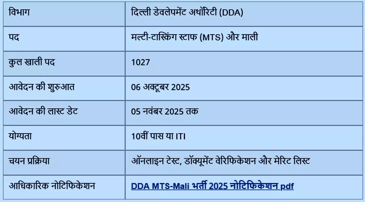 जानकारी के अनुसार, डीडीए की सरकारी भर्ती का लाभ उठाने के लिए उम्मीदवार का 10वीं पास होना जरूरी है। डीडीए एमटीएस और माली पदों पर भर्ती प्रक्रिया 6 अक्टूबर से शुरू हो चुकी है। इस फॉर्म के लिए आवेदन करने की अंतिम तिथि 5 नवंबर 2025 है। इन दो पदों पर एक हजार से ज्यादा खाली पदों पर भर्तियां निकाली गई हैं।