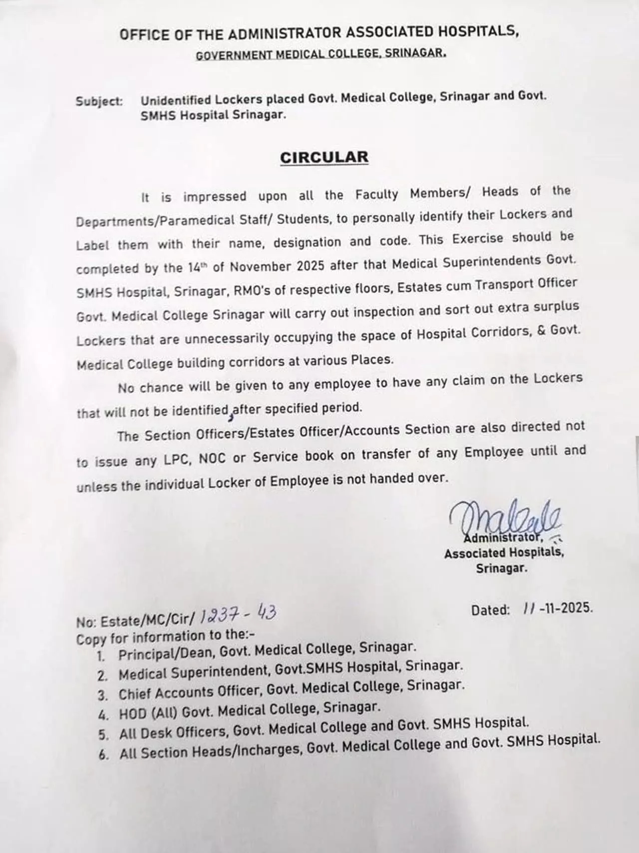 मीडिया रिपोर्ट्स के मुताबिक, गवर्नमेंट मेडिकल कॉलेज, श्रीनगर की तरफ से आदेश जारी कर कहा है कि मेडिकल और पैरामेडिकल स्टाफ और स्टूडेंट्स को 14 नवंबर तक अपने लॉकर पर नाम, पद और कोड इत्यादि का उल्लेख करना होगा। 14 नवंबर के बाद निरीक्षण अभियान चलाया जाएगा। जो भी इन नियमों का पालन नहीं करेगा, उसके लॉकरों को हमेशा के लिए खत्म कर दिया जाएगा। प्रबंधन ने यह भी स्पष्ट किया कि बिना हैंडओवर के एलपीसी/एनओसी नहीं दी जाएगी।