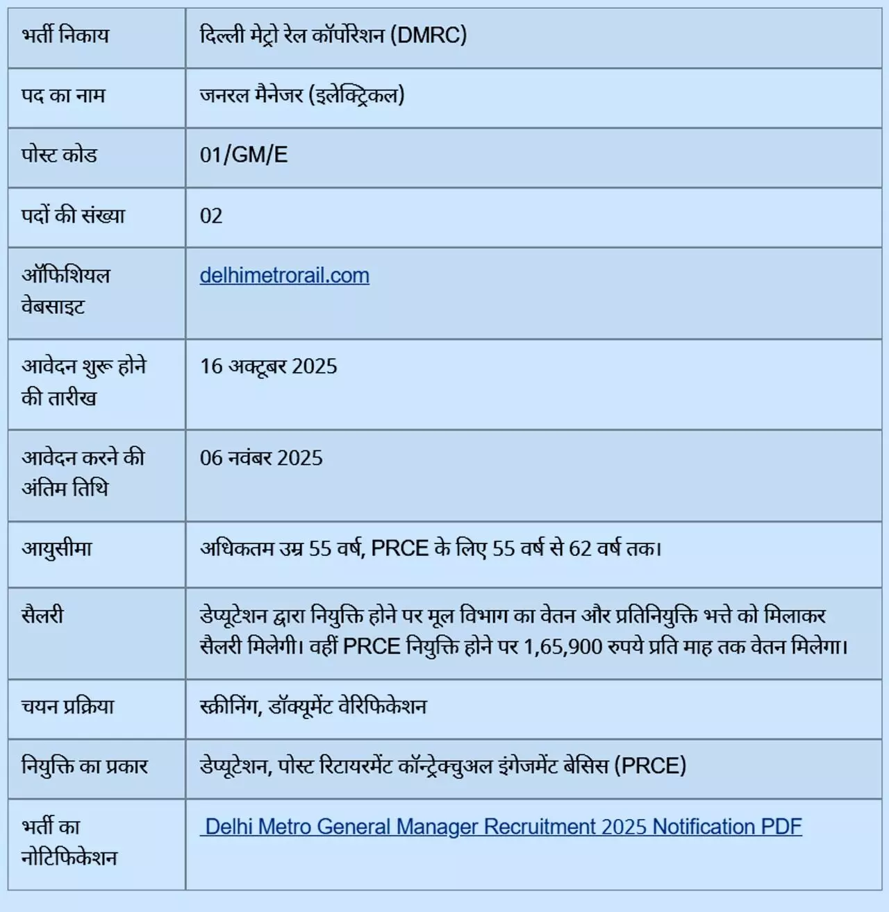DMRC Jobs: अगर आप दिल्ली मेट्रो में नौकरी करने का मन बना रहे हैं, तो अच्छा मौका है। दिल्ली मेट्रो रेल कॉर्पोरेशन ने जनरल मैनेजर के पदों को भरने के लिए नोटिस जारी कर आवेदन मांगे हैं। इसके लिए दिल्ली मेट्री की आधिकारिक वेबसाइट delhimetrorail.com पर आवेदन प्रक्रिया 16 अक्टूबर से शुरू हो चुकी है। वहीं आवेदन करने के लिए अंतिम तिथि 06 नवंबर 2025 निर्धारित की गई है। हालांकि इच्छुक उम्मीदवारों को इसके लिए ऑफलाइन आवेदन करना होगा।