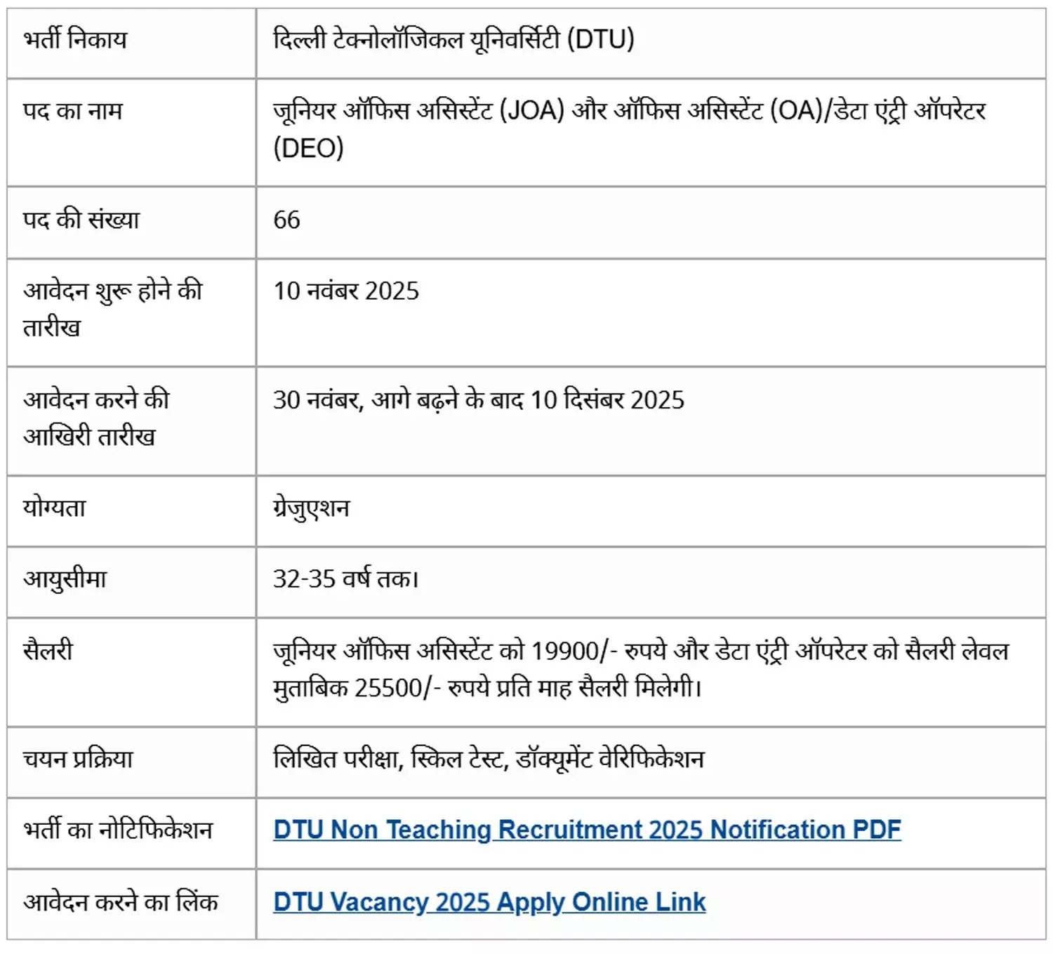 DTU Vacancy 2025: अगर आप दिल्ली यूनिवर्सिटी में नौकरी करना चाहते हैं, तो आपके लिए खुशखबरी है। दिल्ली टेक्नोलॉजिकल यूनिवर्सिटी (DTU) में जूनियर ऑफिस असिस्टेंट (JOA) और ऑफिस असिस्टेंट (OA)/ डाटा एंट्री ऑपरेटर (DEO) में भर्तियां निकली हैं। इसके लिए आवेदन खत्म हो चुके थे लेकिन एक बार फिर आवेदन की तारीख बढ़ाई गई है। अगर आप आवेदन करना चाहते हैं, तो बिना देरी किए ऑफिशियल वेबसाइट dtu.ac.in पर जाकर फॉर्म भर दें। आज आवेदन के लिए अंतिम तिथि है।