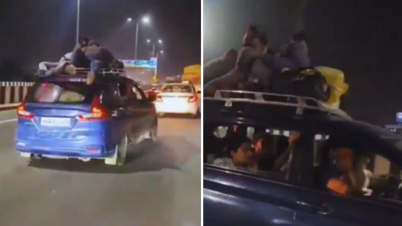 जानकारी के अनुसार, दिल्ली-मेरठ एक्सप्रेसवे पर शुक्रवार देर रात हरियाणा रजिस्ट्रेशन नंबर वाली एक नीली अर्टिगा कार को तेज गति से आते देखा गया। इसका एक वीडियो भी सोशल मीडिया पर वायरल हो रहा है, जिसे देखकर लगता है कि इस कार के पास चल रही कार से ये वीडियो बनाया गया है। इस चलती गाड़ी की छत पर तीन युवक लेटे हुए थे।