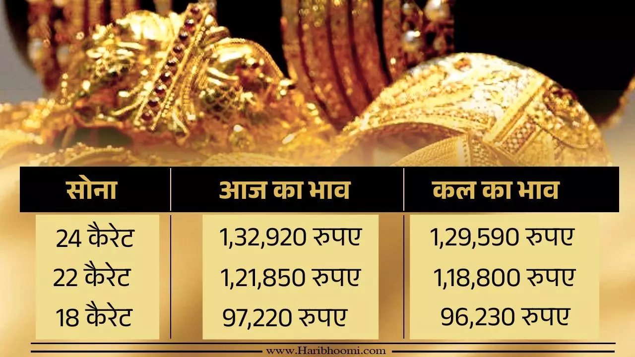 बता दें कि आज सोने की कीमत में 3300 रुपए की बढ़त दर्ज की गई है। 24 कैरेट सोने की कीमत 1,29,590 रुपए प्रति 10 ग्राम थी। आज इसमें 3300 रुपए बढ़कर ये कीमत 1,32,920 रुपए पहुंच गई है। वहीं बीते दिन 22 कैरेट सोने की कीमत 1,18,800 रुपए प्रति 10 ग्राम थी, जो अब बढ़कर 1,21,850 पहुंच गई है। हालांकि 18 कैरेट सोने की कीमत में मामूली गिरावट देखने को मिली है। बीते दिन 18 कैरेट सोने की कीमत 97,230 रुपए प्रति 10 ग्राम थी, जो अब 10 रुपए कम होकर 97,220 रुपए पहुंच गई है। जानकारी के अनुसार, बीते कफी दिनों से सोने की कीमत में लगातार बढ़ोतरी देखने को मिली है। हालांकि 10 अक्टूबर को कीमतों में मामूली गिरावट दर्ज की गई थी।