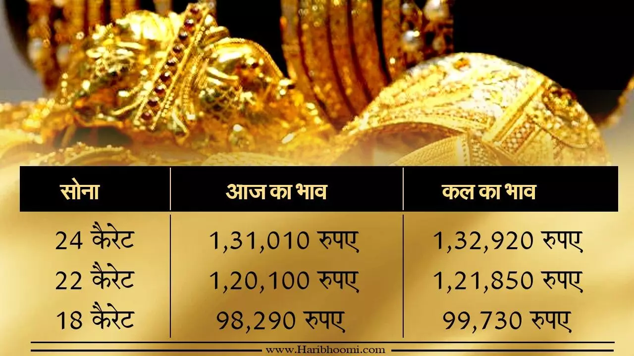 बीते दिन 24 कैरेट सोने की कीमत 1,32,920 रुपए प्रति 10 ग्राम थी। वहीं आज चांदी की कीमत में 1910 रुपए की गिरावट के बाद ये कीमत 1,31,010 रुपए पहुंच गई है। इसके अलावा 22 कैरेट सोने की कीमत 1750 रुपए कम हुई है। बीते दिन 22 कैरेट सोने की कीमत 1,21,850 रुपए प्रति 10 ग्राम थी, जो 1750 रुपए की गिरावट के बाद 1,20,100 रुपए पहुंच गई है। 18 कैरेट सोने की कीमत में 1440 रुपए की गिरावट दर्ज की गई है। बता दें कि बीते दिन 18 कैरेट सोने की कीमत 99,730 रुपए प्रति 10 ग्राम थी, जो अब कम होकर 98,290 रुपए पहुंच गई है।