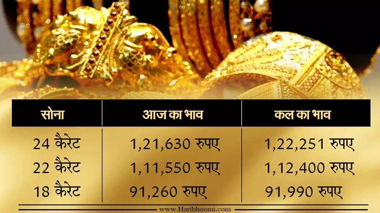 - बता दें कि आज 24 कैरेट सोने की कीमतों में 880 रुपए प्रति 10 ग्राम की गिरावट दर्ज की गई है। बीते दिन 24 कैरेट सोने की कीमत 1,22,1510 रुपए प्रति 10 ग्राम थी, जो आज 880 रुपए कम होकर 1,21,630 रुपए प्रति 10 ग्राम हो गई है।