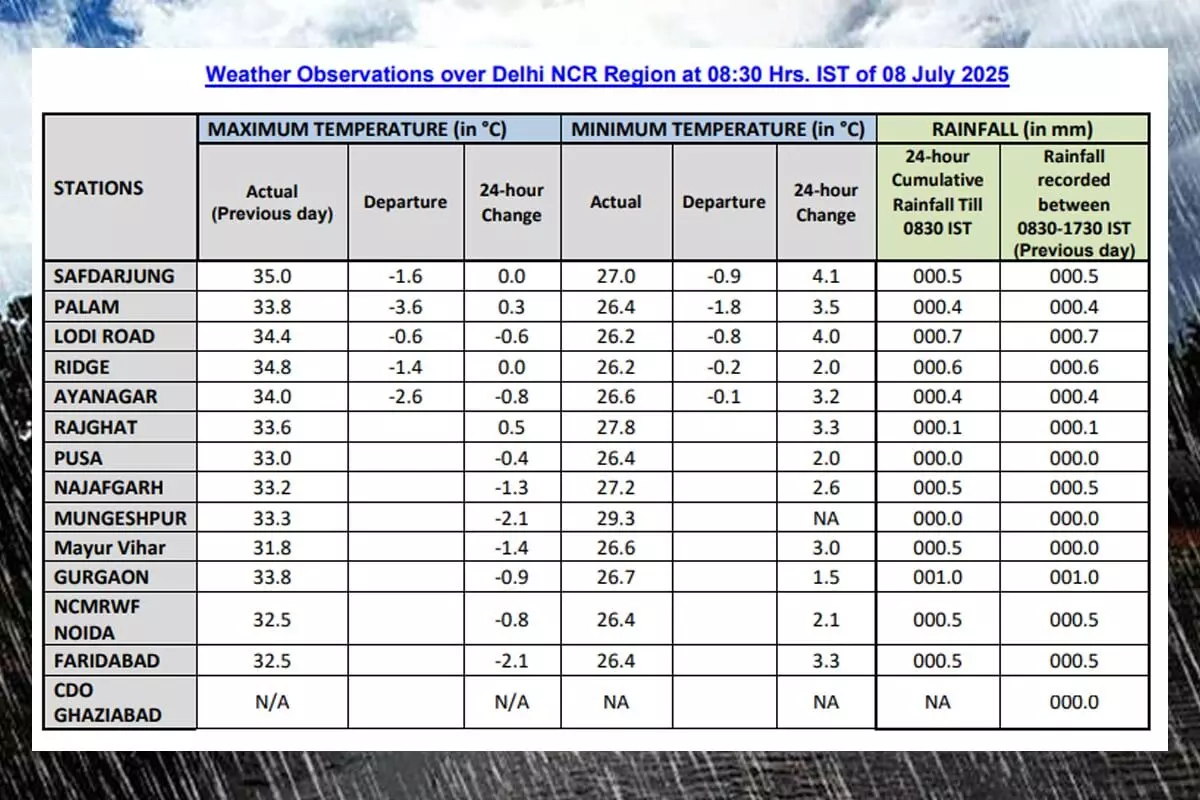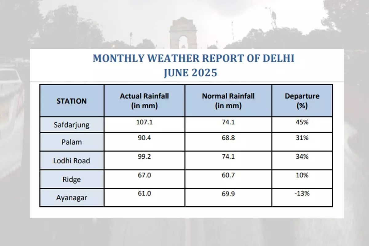 आईएमडी की जून 2025 की रिपोर्ट के मुताबिक, इस महीने 424.7 एमएम बारिश हो चुकी है। सफदरजंग केंद्र पर 107 एमएम, पालम में 90.4 एमएम, लोधी रोड 99.2 एमएम, रिज में 67 एमएम और आया नगर में 61 एमएम बारिश दर्शायी गई है। जलवायु विज्ञान 1971-2020 के मुताबिक सामान्य बारिश की बात करें तो सफदरजंग केंद्र पर 74.1, पालम में 68.8, लोधी रोड 74.1, रिज में 60.7 और आया नगर में 69.9 एमएम बारिश होती है। नीचे आंकड़ों पर गौर करेंगे तो पाएंगे कि आया नगर को छोड़कर बाकी सभी केंद्रों पर सामान्य से अधिक बारिश दर्ज की गई है।