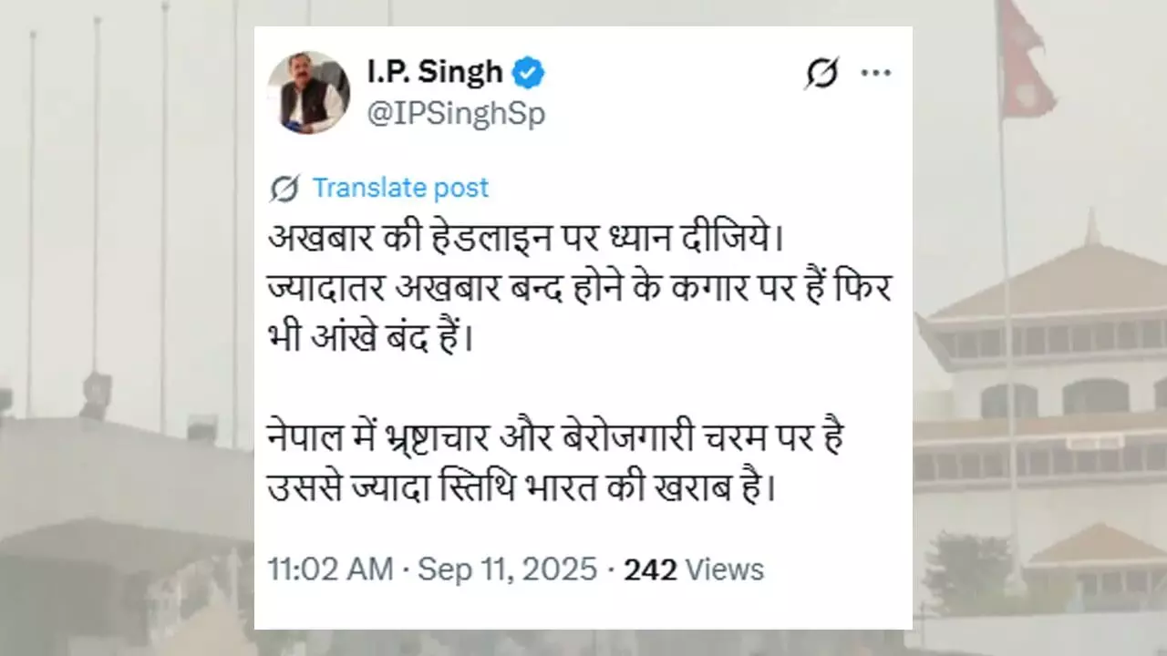 समाजवादी पार्टी के वरिष्ठ नेता आईपी सिंह भी लगातार ऐसे ट्वीट कर रहे हैं, मानों लोगों को सड़कों पर उतरने के लिए उकसा रहे हैं। आज भी उन्होंने अपने सोशल मीडिया अकाउंट एक्स पर एक समाचार पत्र की प्रति शेयर करते हुए लिखा कि अखबार की हेडलाइन पर ध्यान दीजिए। ज्यादातर अखबार बंद होने की कगार पर हैं, फिर भी आंखें बंद हैं। उन्होंने कहा कि नेपाल में भ्रष्टाचार और बेरोजगारी चरम पर है, लेकिन भारत की स्थिति उससे ज्यादा खराब है। इसके अलावा भी कई नेता हैं, जो कि नेपाल से ज्यादा भारत के हालात बदतर बता रहे हैं।