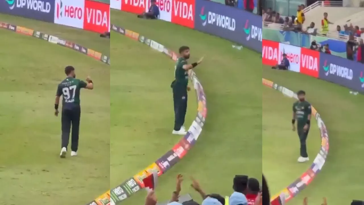 भारत पाकिस्तान मैच में पाकिस्तानी खिलाड़ी पूरी दुनिया के सामने भारत का मज़ाक़ बना रहा है। वो भारतीय जहाज को गिराने वाले इशारे कर रहा है ।