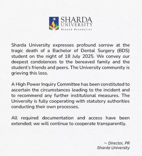 शारदा यूनिवर्सिटी के PRO डॉक्टर अजीत कुमार ने कहा कि छात्रा ने सुसाइड किया है। हम परिवार के साथ खड़े हैं। फिलहाल 2 टीचर को सस्पेंड किया गया है। जांच के लिए एक कमेटी भी बनाई गई है। कमेटी की रिपोर्ट के बाद जो दोषी पाया जाएगा, उस पर कार्रवाई की जाएगी।