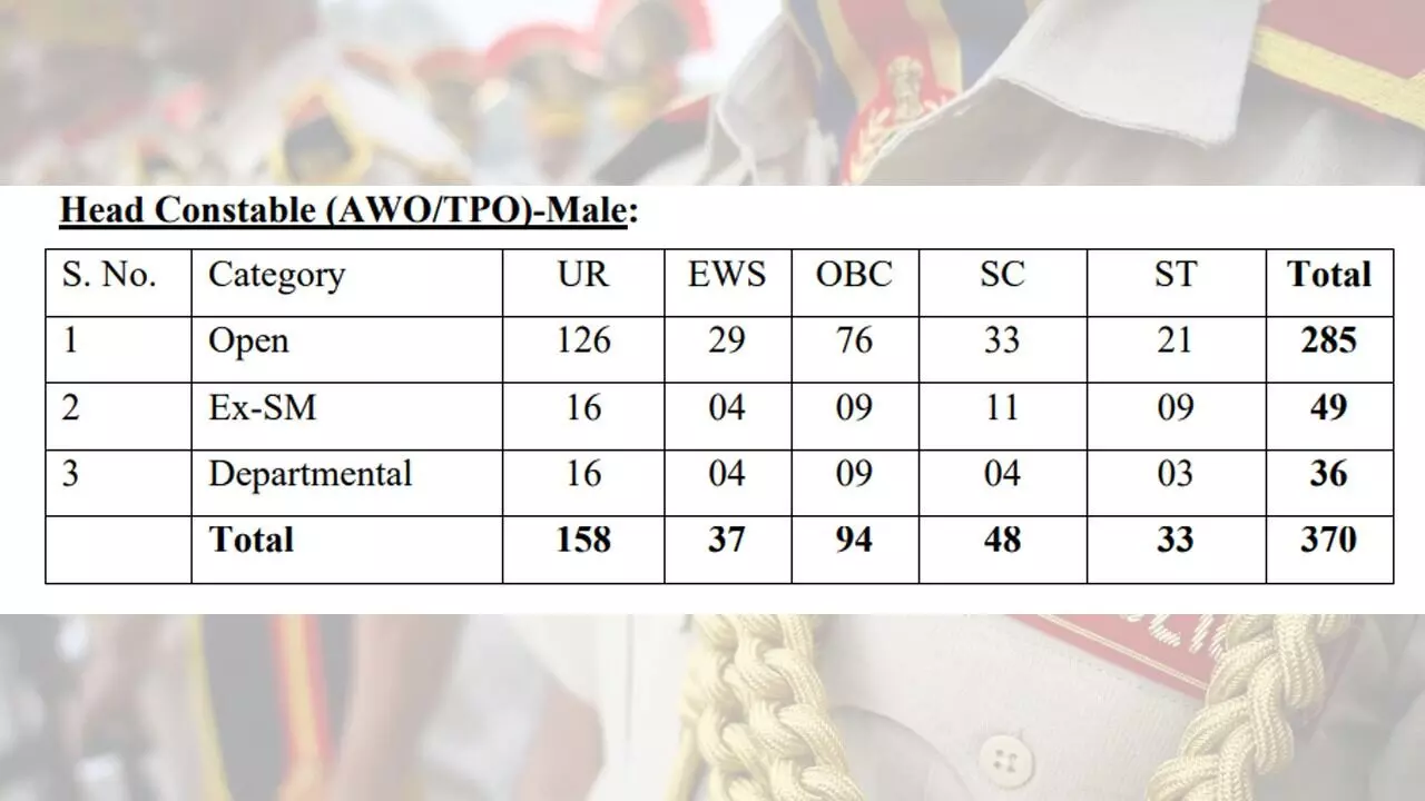 नोटिफिकेशन के अनुसार, पुरुषों के लिए हेड कांस्टेबल (AWO/TPO) के कुल 370 पदों पर भर्ती निकाली गई है। इनमें जनरल कैटेगरी के लिए 158, ईडब्ल्यूएस के लिए 37, ओबीसी के लिए 94, एससी के लिए 48 और एसटी के लिए 33 पदों पर भर्ती निकाली गई है।