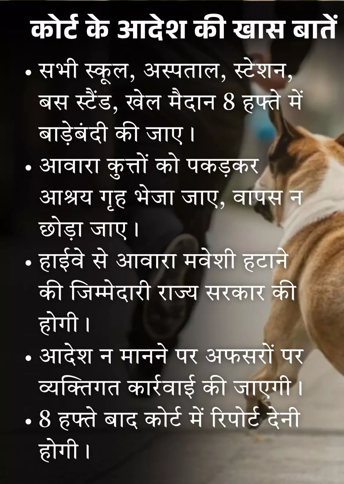 - आवारा कुत्तों को पकड़कर आश्रय गृह भेजा जाए, वापस न छोड़ा जाए।