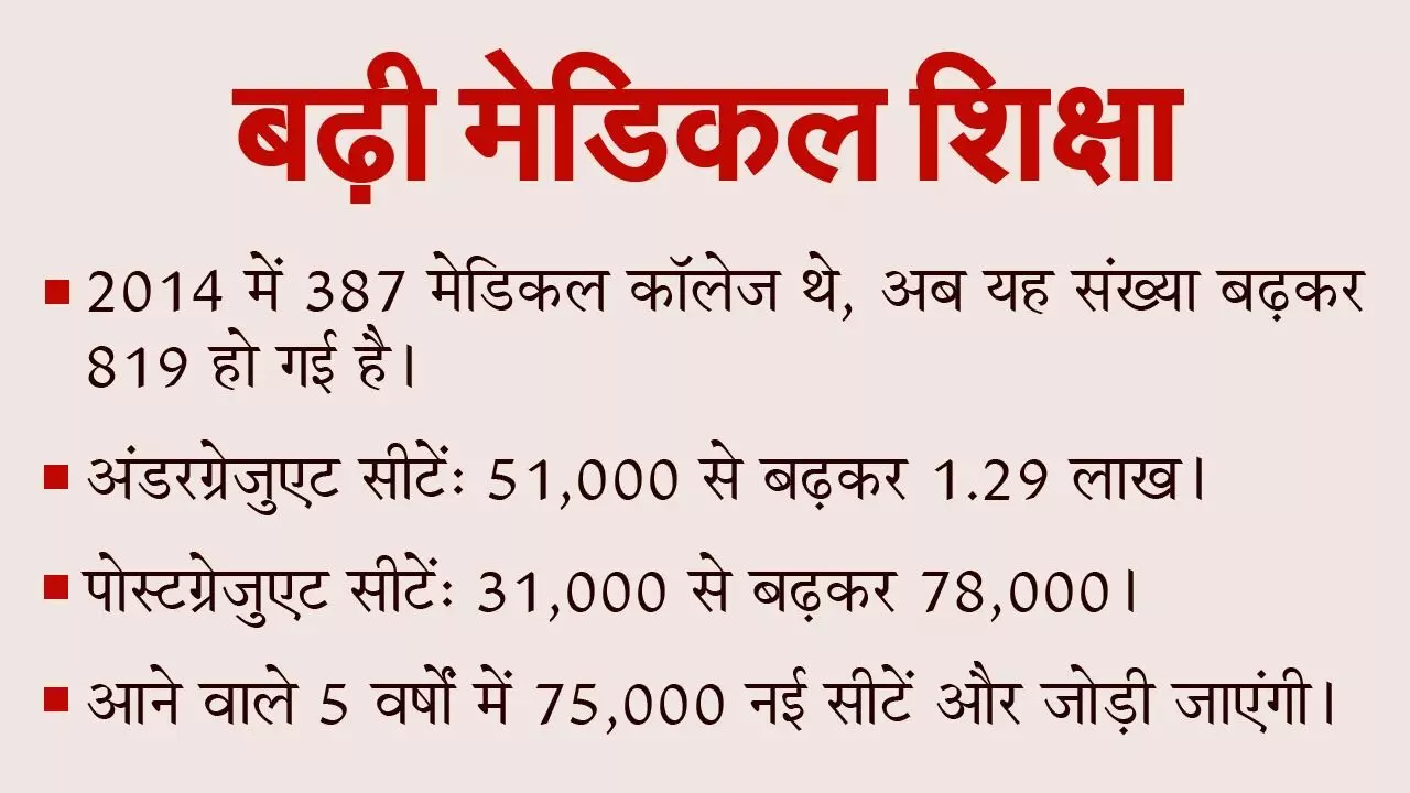 उन्होंने आगे कहा कि 11 सालों पहले देश में 387 मेडिकल कॉलेज थे। हालांकि अब मेडिकल कॉलेज की संख्या बढ़कर 819 हो गई है। इसी तरह पहले अंडर ग्रेजुएट मेडिकल सीटें 51 हजार थीं, जो अब बढ़कर 1.29 लाख हो गई हैं। वहीं पोस्ट ग्रेजुएट सीटें 31 हजार से बढ़कर 78 हजार हो गई हैं। केंद्रीय मंत्री जेपी नड्डा ने बताया कि आने वाले 5 सालों में अंडर ग्रेजुएट और पोस्ट ग्रेजुएट स्तर पर अतिरिक्त 75 हजार सीटें जोड़ी जाएंगी।
