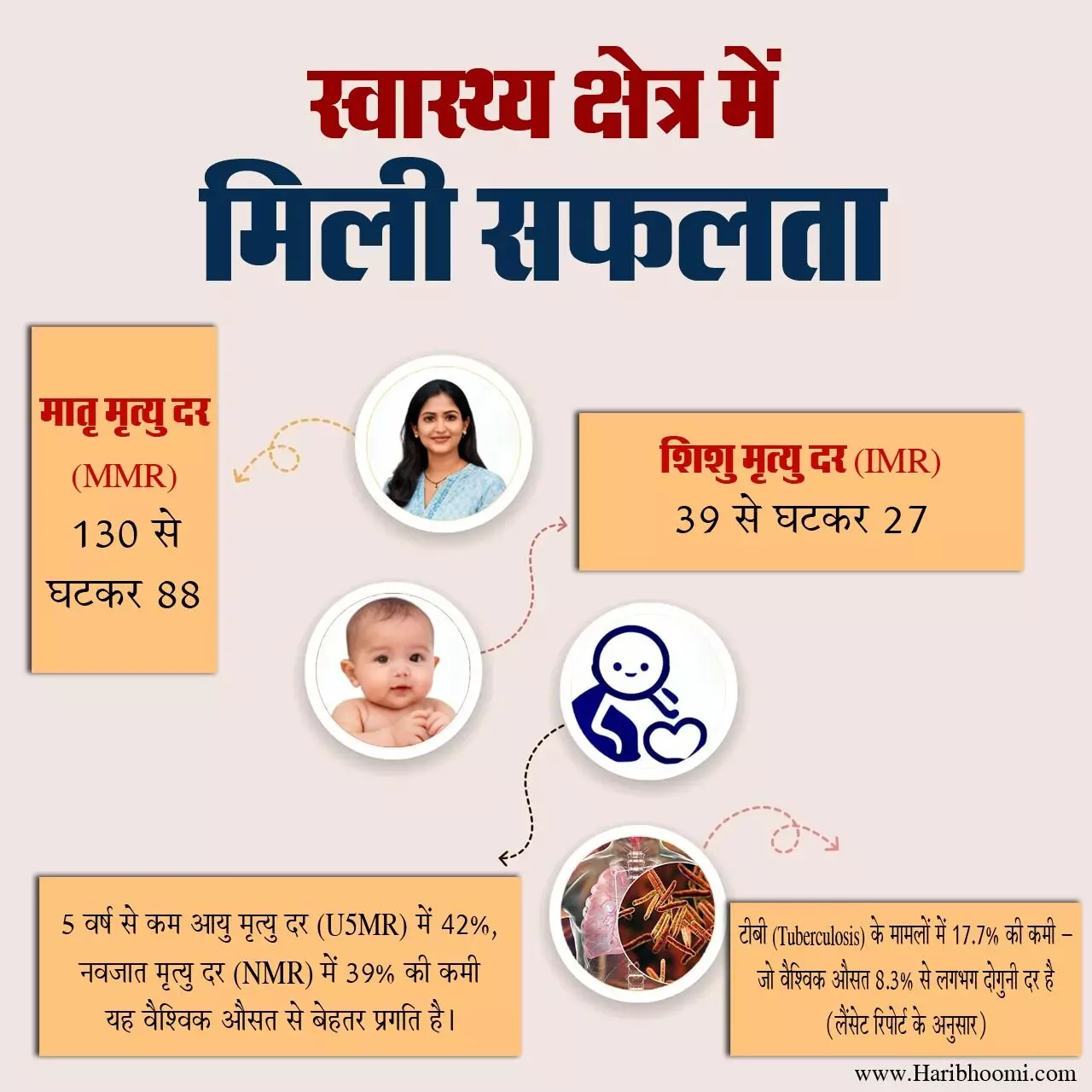 एम्स में संबोधन के दौरान केंद्रीय स्वास्थ्य मंत्री ने बताया कि भारत ने मातृ और शिशु स्वास्थ्य क्षेत्र में भी प्रगति की है। एसआरएस के आंकड़ों के अनुसार, मातृ मृत्यु दर (एमएमआर) पहले 130 थी, जो अब घटकर 88 हुई है। वहीं शिशु मृत्यु दर (आईएमआर) 39 थी, जो घटकर 27 हो गई है। 5 साल से कम आयु की मृत्यु दर (यू5एमआर) में 42 फीसदी और नवजात मृत्यु दर (एनएमआर) में 39 फीसदी की कमी आई है, जो वैश्विक औसत से अधिक है। उन्होंने 'द लैंसेट रिपोर्ट' का हवाला देते हुए बताया कि भारत में टीबी के मामलों में 17.7 फीसदी की गिरावट दर्ज की गई है। ये वैश्विक दर 8.3 प्रतिशत से लगभग दोगुनी है।