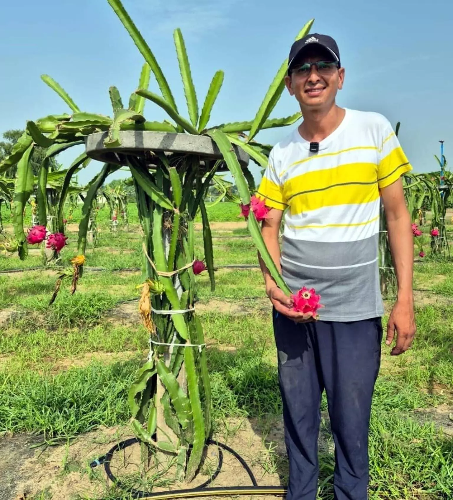 भट्टूकलां क्षेत्र के गांव दैरूयड़ में अपने खेत में लगे ड्रेगन फ्रूट दिखाते सुनील कुमार।