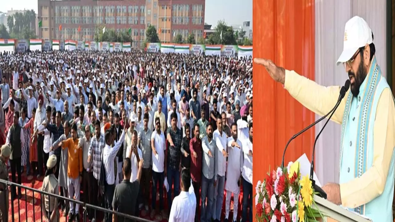अंबाला में राज्य स्तरीय समारोह में उपस्थित मुख्यमंत्री नायब सिंह सैनी व उपस्थित जनसमूह।