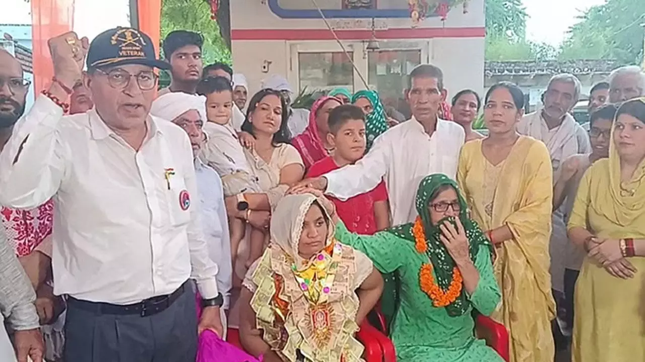 शहीद अरविंद सांगवान की पत्नी को सम्मानित करते ग्रामीण।