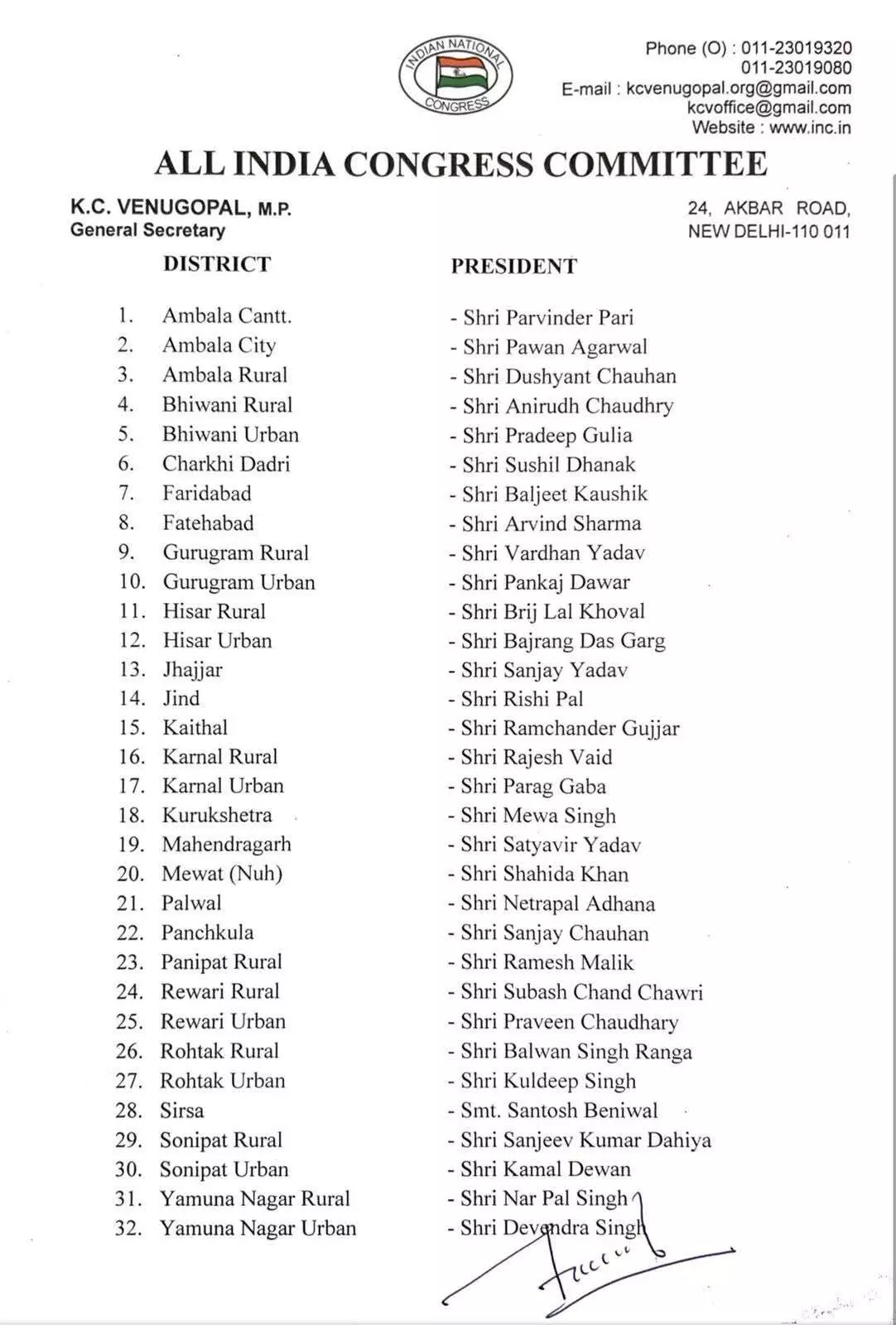 हरियाणा में कांग्रेसियों का इंतजार खत्म : लंबे इंतजार के बाद हरियाणा कांग्रेस ने मंगलवार देर शाम अपने जिलाध्यक्षों की नियुक्ति कर दी। अखिल भारतीय कांग्रेस कमेटी AICC के महासचिव केसी वेणुगोपाल द्वारा जारी सूची में कुल 32 नेताओं के नाम शामिल हैं। यह नियुक्ति पार्टी के प्रदेश संगठन को मजबूत करने की दिशा में एक अहम कदम माना जा रहा है, क्योंकि 11 साल बाद राज्य में जिलाध्यक्षों की नियुक्ति हुई है। अभी सूची में पानीपत शहरी सीट का नाम नहीं आया है।
