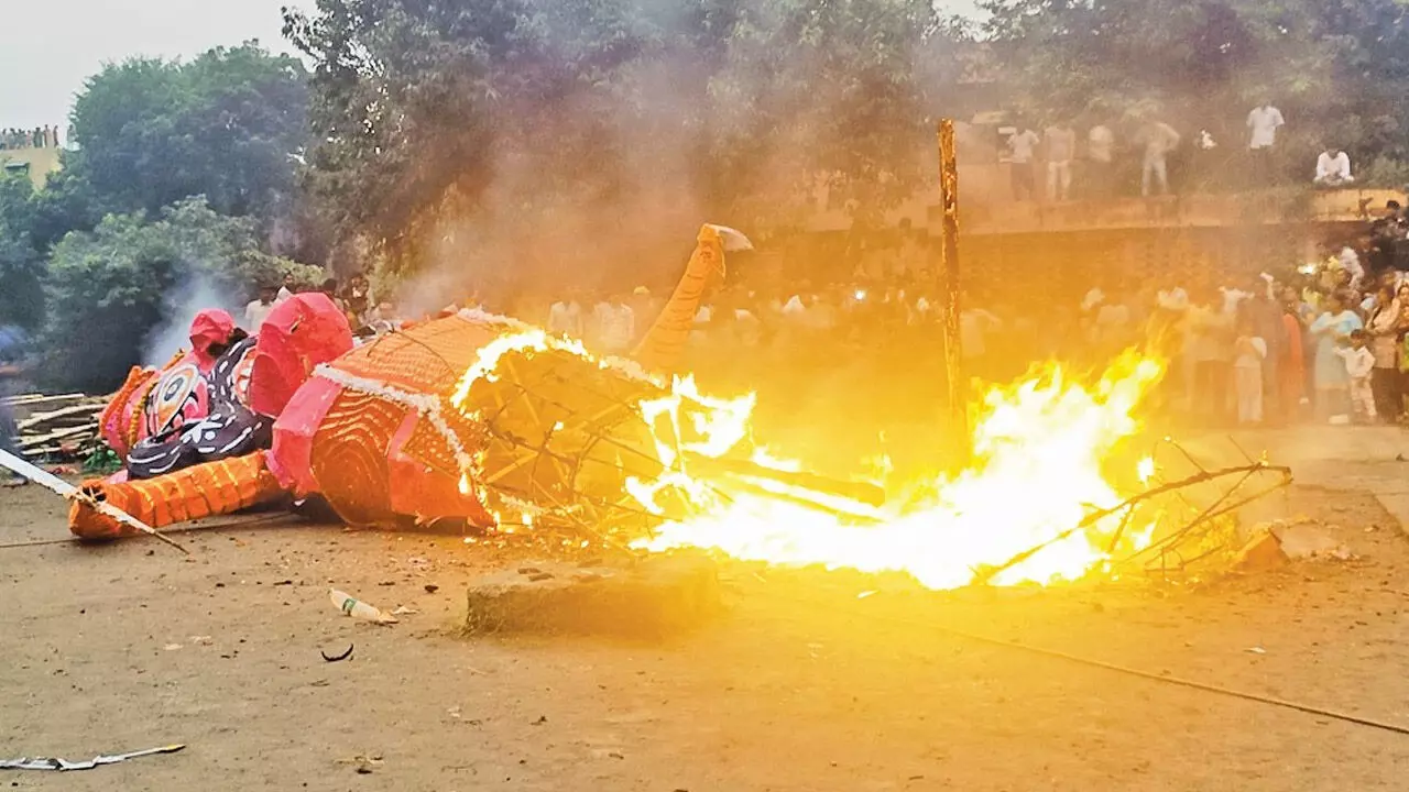 हरियाणा दशहरा उत्सव: बारिश ने डाला रावण दहन में खलल, भीगे पुतलों को नीचे गिराकर पेट्रोल डाल लगाई आग