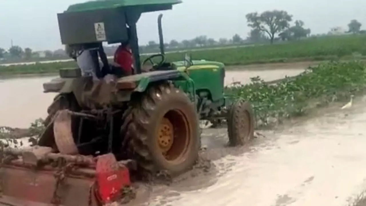 सिरसा में सेमग्रस्म क्षेत्र में जलभराव से नरमा की फसल पर ट्रैक्टर चलाते किसान।