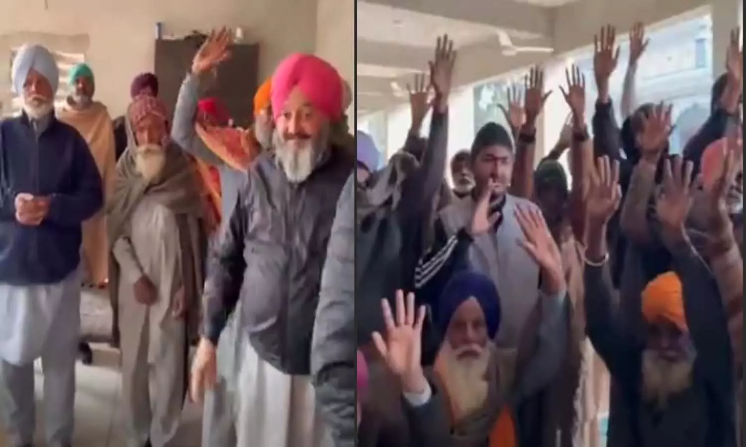 फतेहाबाद के गांव महमदकी में पंचायत में हाथ उठाकर फैसले का समर्थन करते लोग।