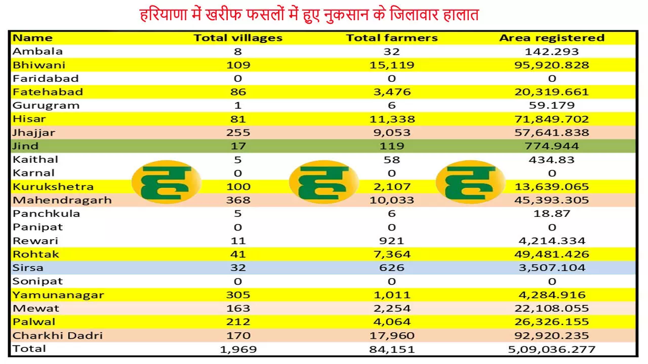 ई क्षतिपूर्ति पोर्टल पर दर्ज किसानों के दावों के मुताबिक सबसे ज्यादा नुकसान महेंद्रगढ़ के किसानों ने बताया है। यहां 368 गांवों के 10033 किसानों ने 45393 एकड़ में नुकसान दर्ज करवाया है। वहीं, यमुनानगर के 305 गांवों के 1011 किसानों ने 4284 एकड़ फसल में खराबा बताया है। वहीं, फरीदाबाद, करनाल, पानीपत व सोनीपत के किसानों का कोई दावा अभी लिस्ट में अपडेट नहीं हुआ है। हालांकि यहां भी फसलों में नुकसान है।